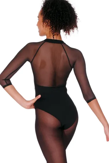 Dani Black Microfibre Leotard with ¾ Sleeves & Mesh Detailing