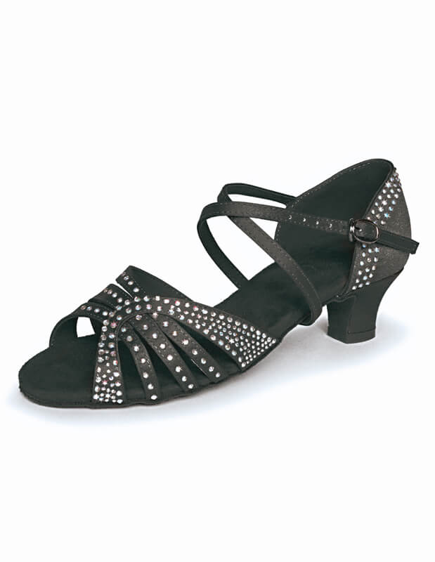 Roch Valley RV812 Girls Ladies Spanish Heel Ballroom Shoes.Ballroom Shoe is designed and manufactured with X straps and a 1.5 inch spanish heel,beautiful diamante detail. A very soft comfortable lightweight stylish ballroom shoeColours: Flesh Satin, Black Satin.Sizes: UK Size 13 - 8 Large. Half Sizes from 1.5.